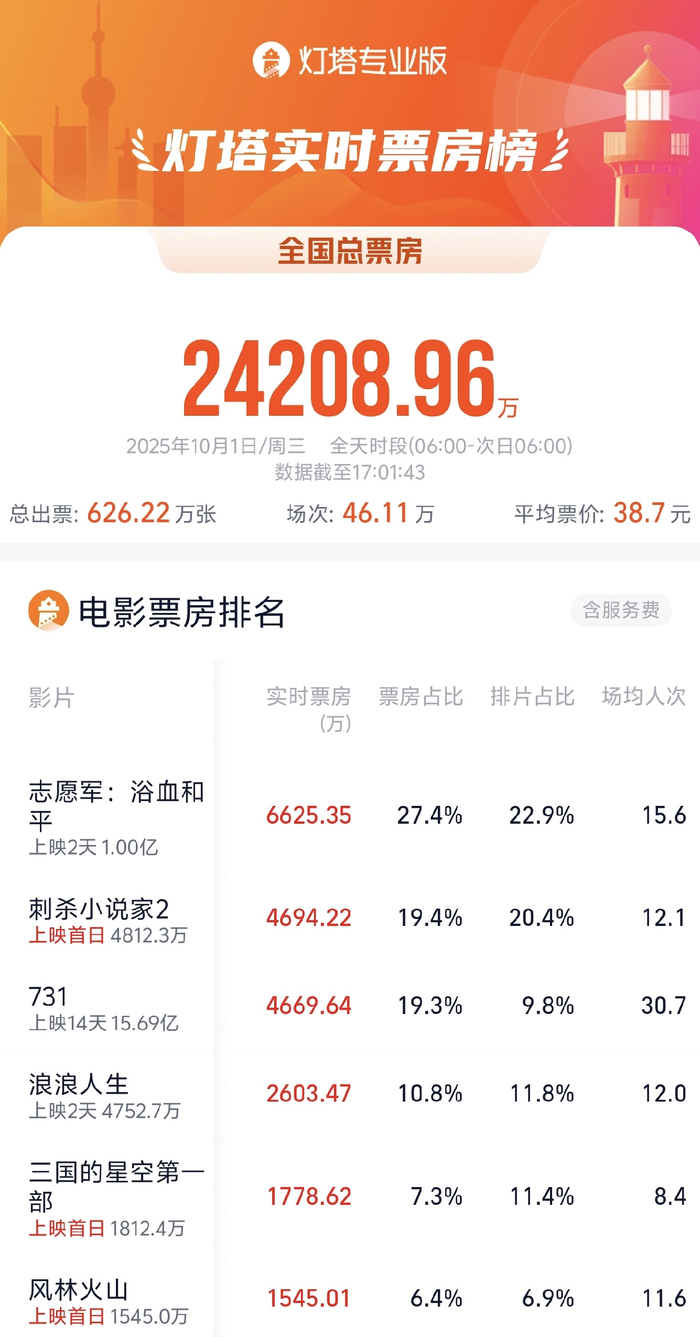 据灯塔专业版数据,截至10月1日17时,2025国庆档首日票房达2.42亿元。《志愿军:浴血和平》《刺杀小说家2》《731》《浪浪人生》《三国的星空第一部》暂列当日票房前五名。