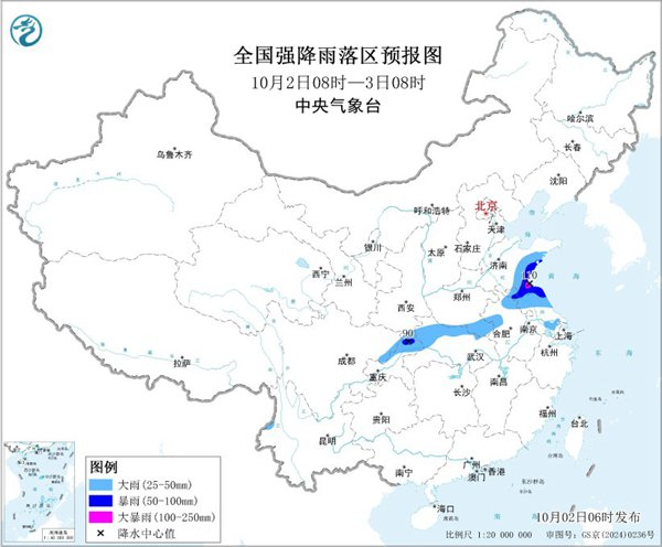 央视网消息:中央气象台10月2日06时继续发布暴雨蓝色预警,预计,10月2日08时至3日08时,山东东部和南部、江苏北部和南部、河南南部、安徽北部、湖北北部、四川东北部、重庆北部、陕西东南部以及云南西部等地部分地区有大到暴雨,其中,江苏北部等地部分地区有大暴雨(100~110毫米)。上述部分地区伴有短时强降水(最大小时降雨量20~50毫米,局地可超过60毫米),局地有雷暴大风等强对流天气。