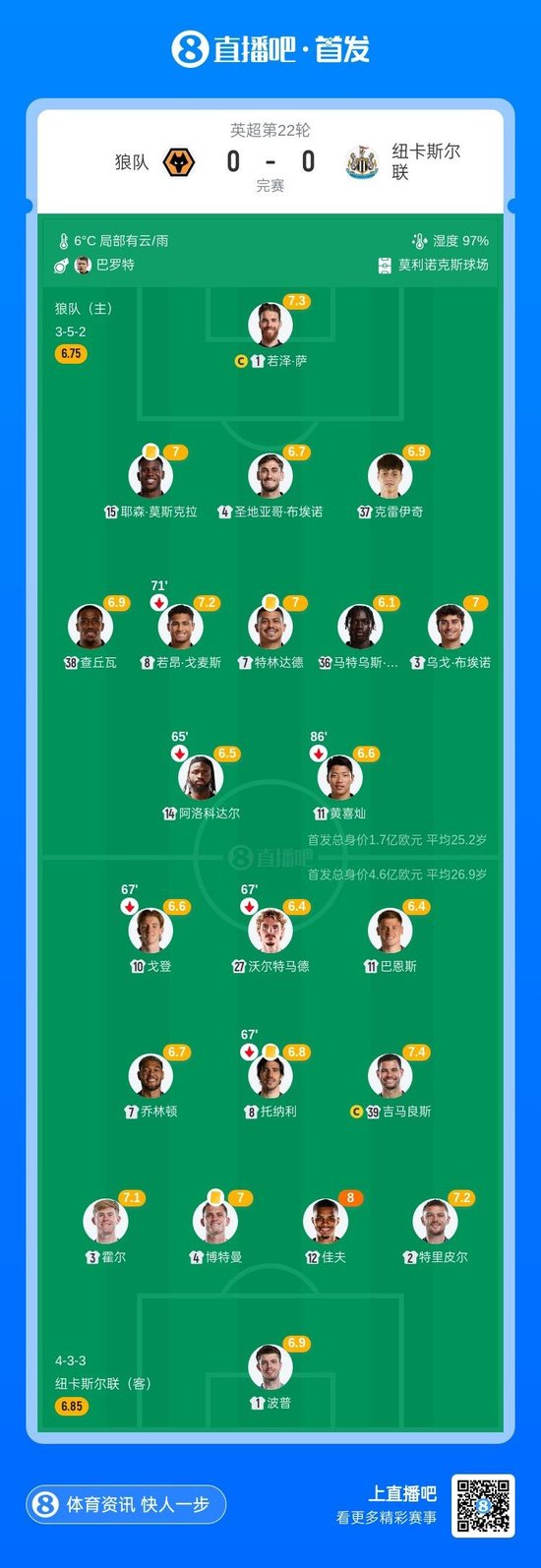 直播吧1月18日讯 北京时间22:00,英超第22轮狼队vs纽卡斯尔联,比赛在莫利纽球场打响!上半场,沃尔特马德头球顶偏。下半场,特里皮尔任意球攻门造险;若泽·萨两连扑救主。最终,狼队0-0逼平纽卡,英超近4轮不败斩获6分;纽卡英超三连胜终结,各项赛事3场不胜。