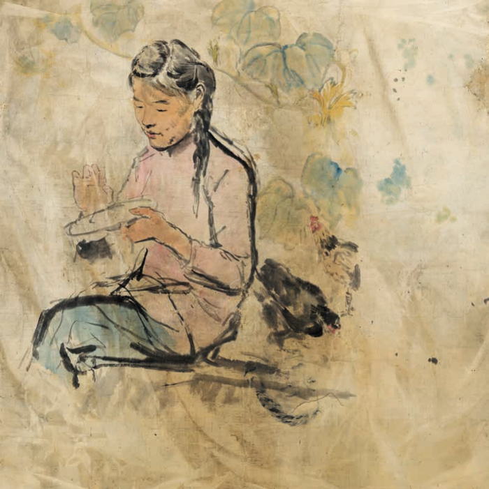 蒋兆和 《〈织毛衣女〉画稿》 水墨设色 纸本 109.3cm×109.2cm 20世纪50至60年代
