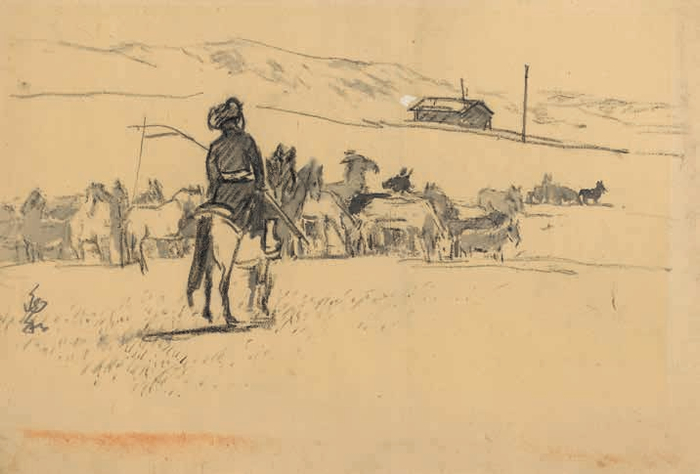蒋兆和 《塞上写生·草原牧马》 铅笔 纸本 19cm×28cm 1958年