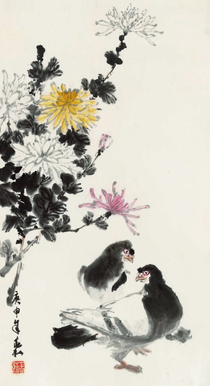 蒋兆和 《秋菊双鸽图》 水墨设色 纸本 68.5cm×37.4cm 1980年
