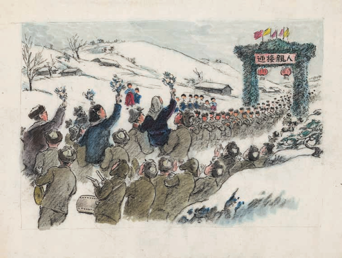 蒋兆和 《迎接亲人——志愿军部队热烈欢迎慰问团》 水墨设色 纸本 21.8cm×32.4cm 1956年