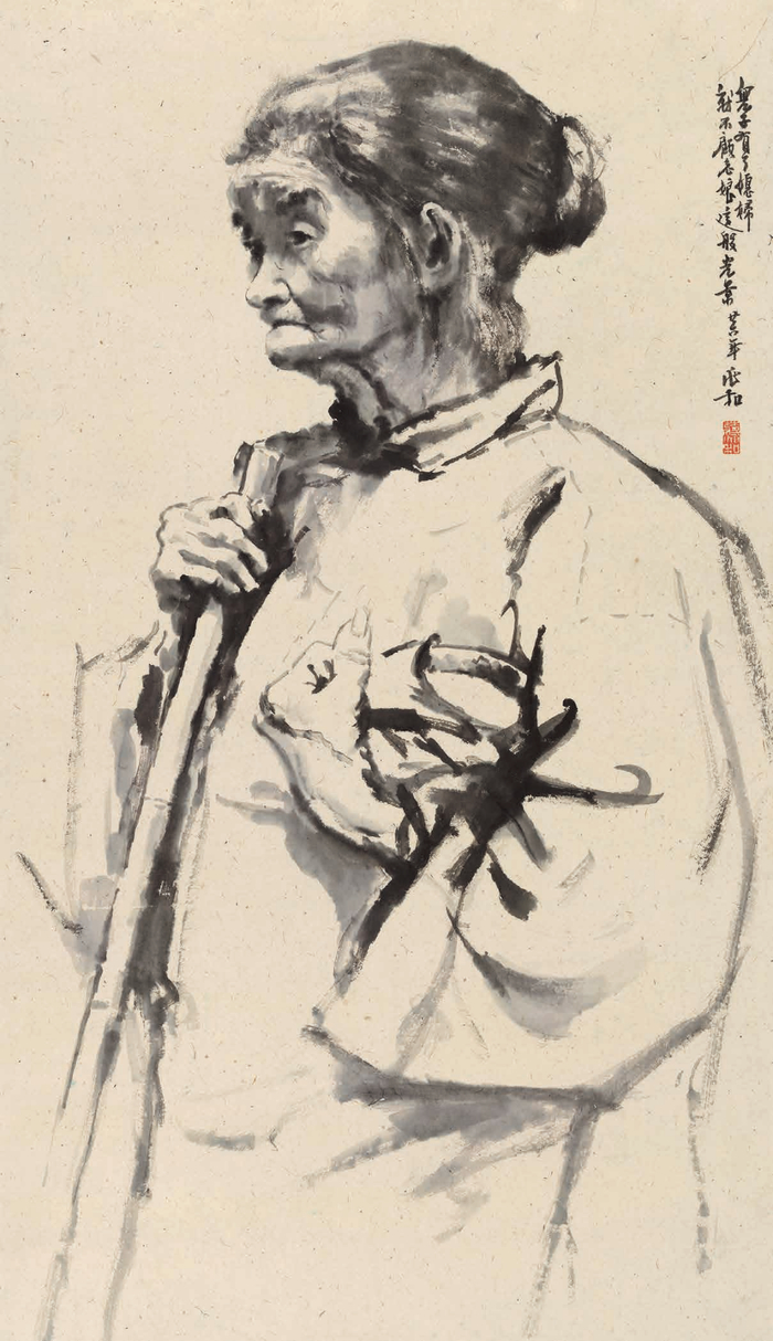蒋兆和先生的艺术实践,解决了中国水墨人物画现代转型的时代课题,确立了艺术关怀现实、承载历史的道德高度,他超越了简单的“以素描入水墨”的技法融合,在西方写实造型的体与中国水墨写意的魂之间,构建起可以安放现代中国人精神的艺术形式,使水墨人物画从传统文人的书斋雅趣中解放出来,成为观照现实、记录历史的视觉史诗。