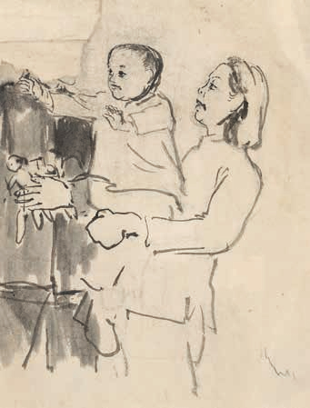 蒋兆和 《〈与孩子们〉画稿》 水墨设色 纸本 45cm×29.9cm 1950年