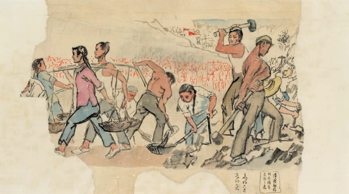 蒋兆和 《〈劈岭移山修水库〉初稿》 水墨设色 纸本 45cm×81.5cm 1958年